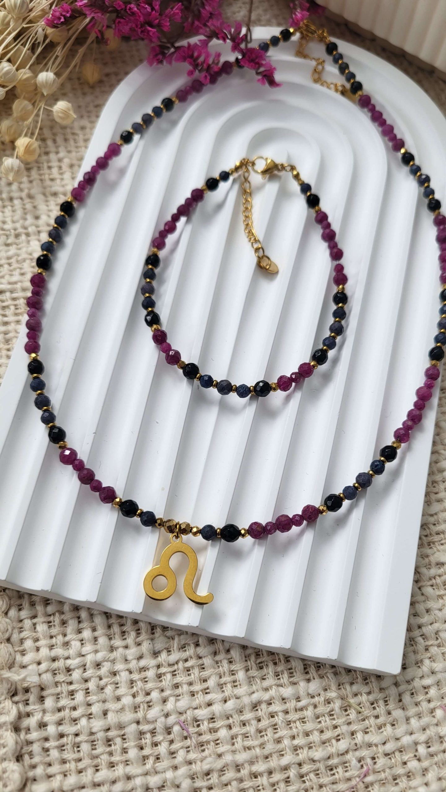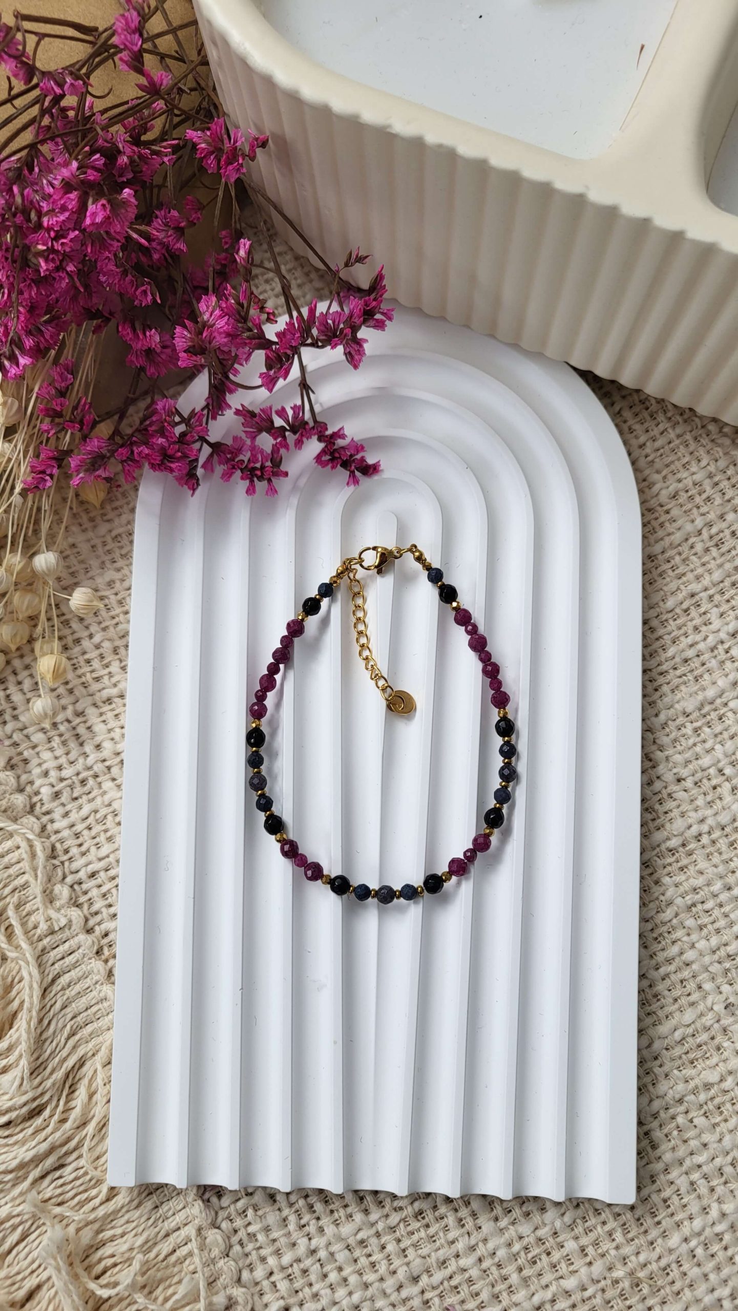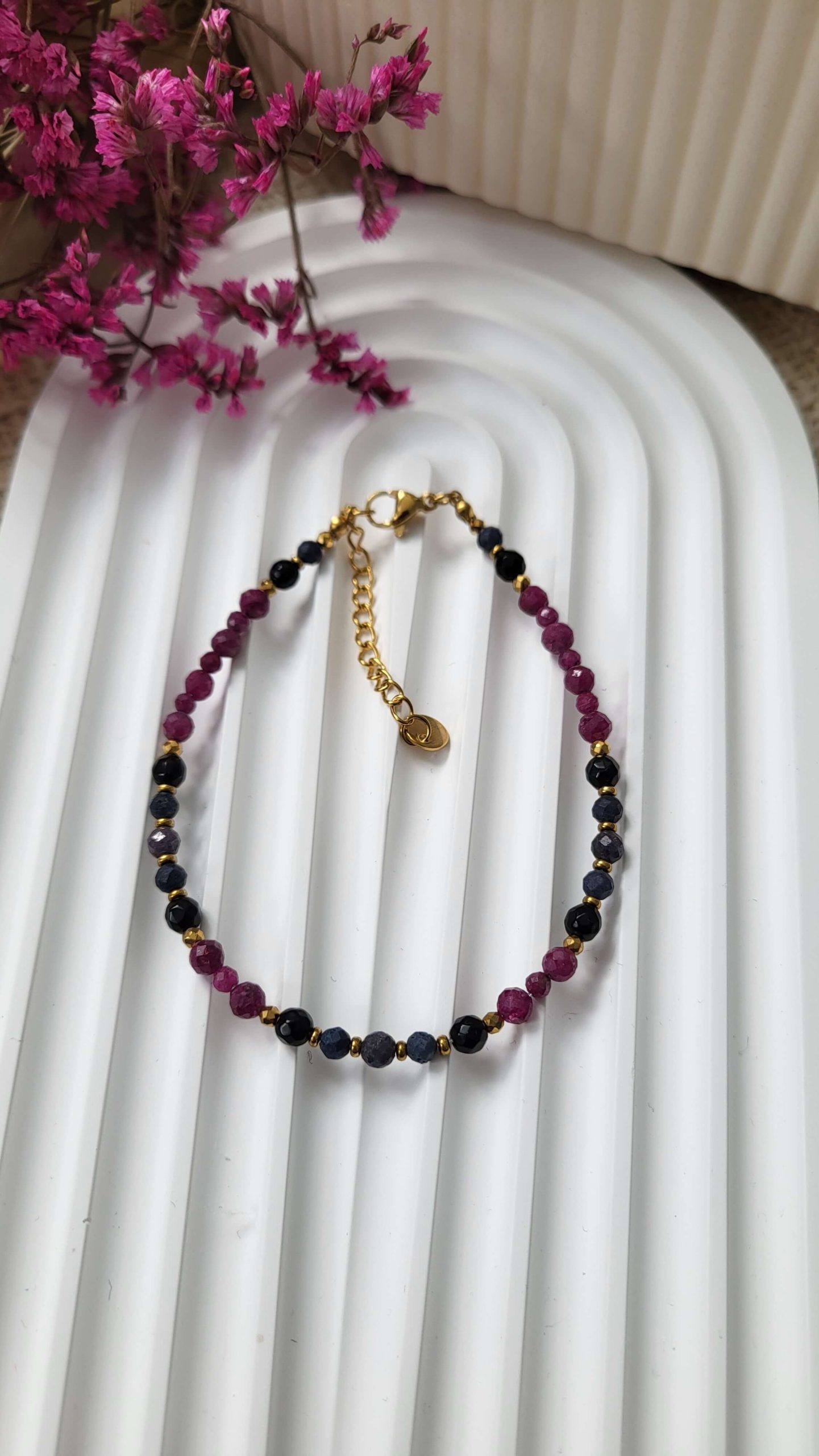 Ręcznie wykonana bransoletka z rubinu 3 i 4mm, szafiru 3 i 4mm oraz onyksu 4mm